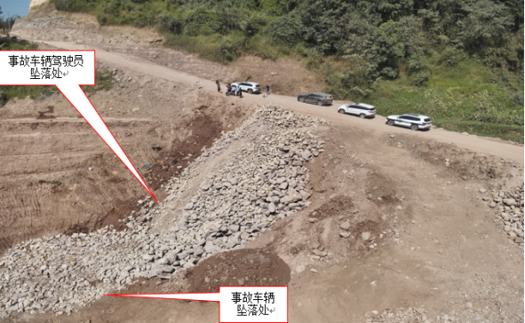 事故现场位于綦江区永新镇新胜村陈家嘴组路段,该路段不属于国道、省道、县道及乡道、村道,附近农户车辆和社会车辆均有通行。路面宽度约5.6米,泥结石路面,道路为南北走向,南高北低,道路坡度约10°。道路西侧为原貌荒坡,道路东侧为弃渣堆场,事发路段车辆侧翻点与坡底落差约15米,坡面角约35°,道路临边设置高度约0.6米路挡。